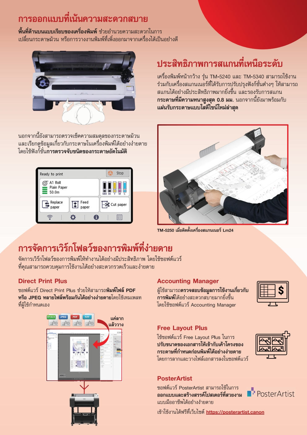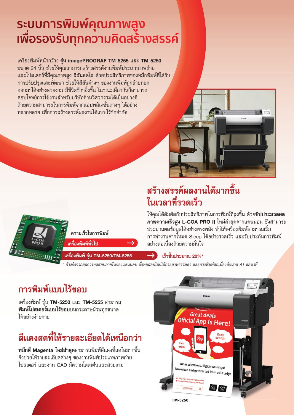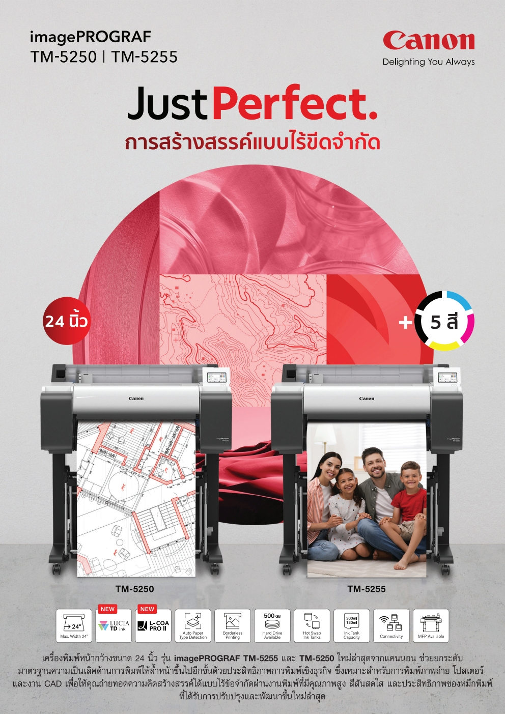 Canon imagePROGRAF TM-5250ก้าวข้ามขอบเขตความคิดสร้างสรรค์เครื่องพิมพ์หน้ากว้างใหม่ imagePROGRAF TM-5250 ขนาด 24 นิ้ว ยกระดับความเป็นเลิศในการพิมพ์งานเชิงธุรกิจด้วยประสิทธิภาพที่เพิ่มขึ้น สำหรับการผลิตผลงานพิมพ์ภาพถ่าย ภาพโปสเตอร์ และงานเขียนแบบ CAD สามารถนำเสนอความคิดสร้างสรรค์ผ่านการพิมพ์คุณภาพสูงที่มีสีสันสดใสได้อย่างไม่มีขีดจำกัดด้วยเทคโนโลยีด้านหมึกพิมพ์ที่ได้รับการปรับปรุง |