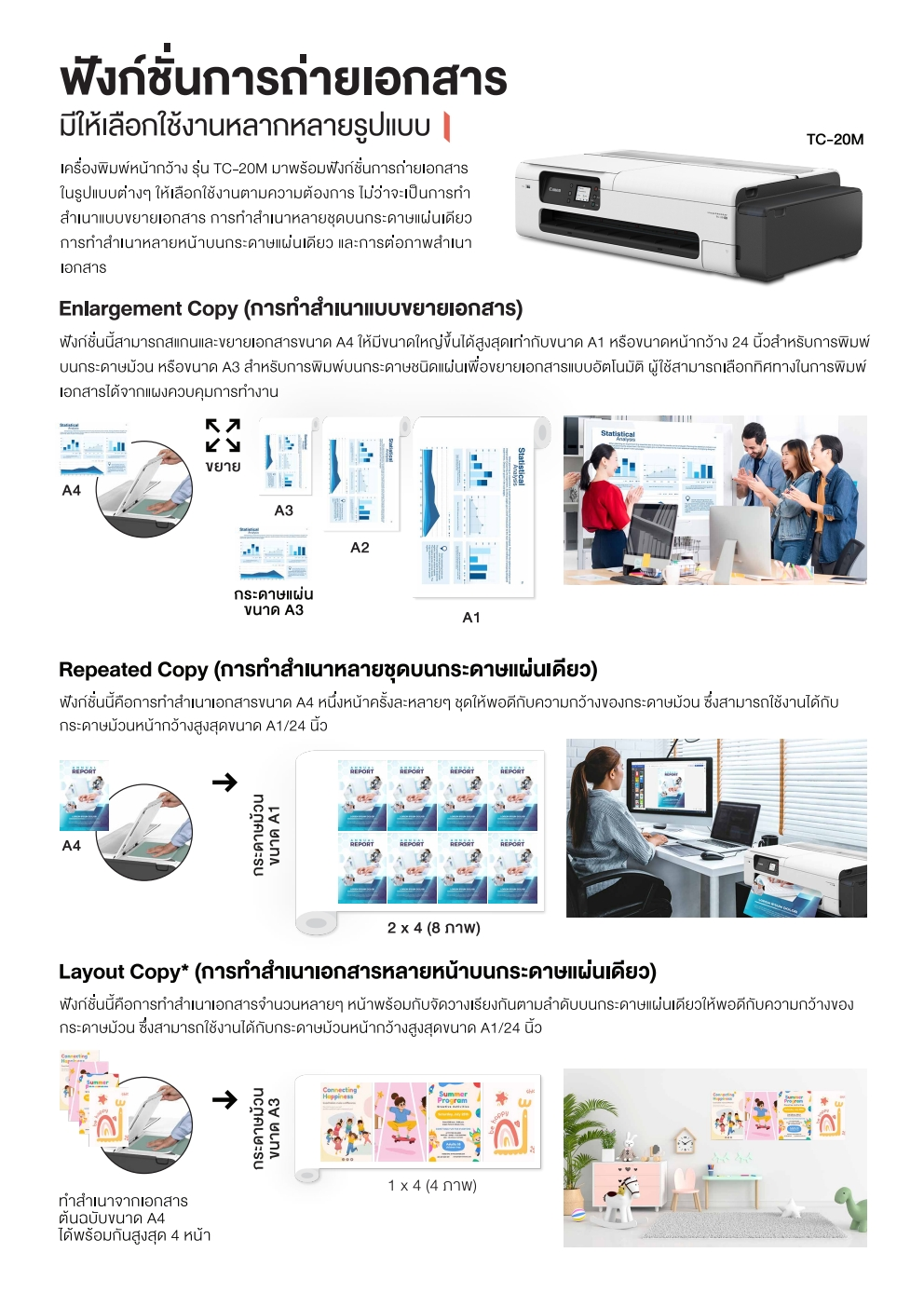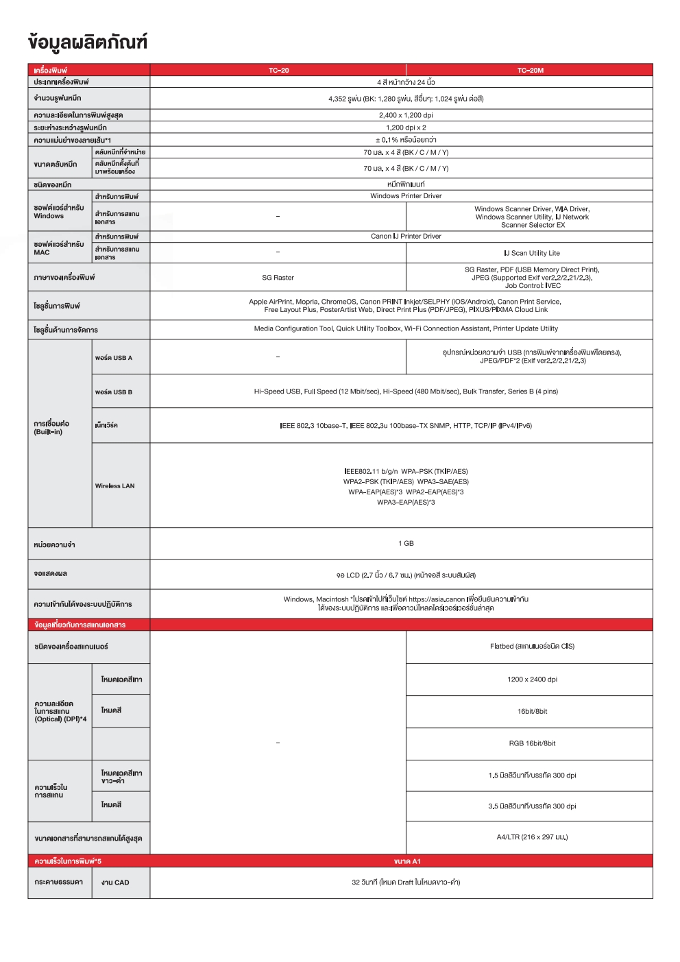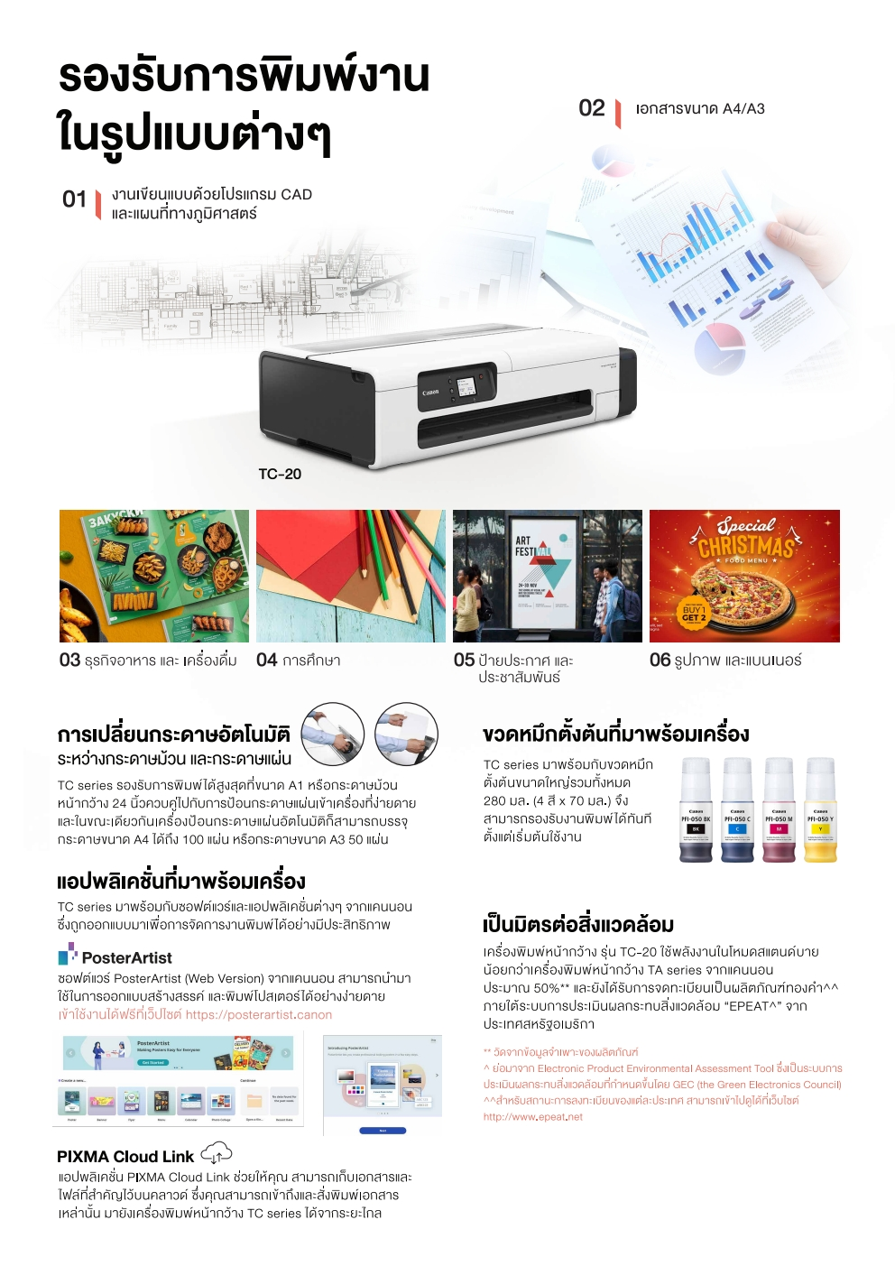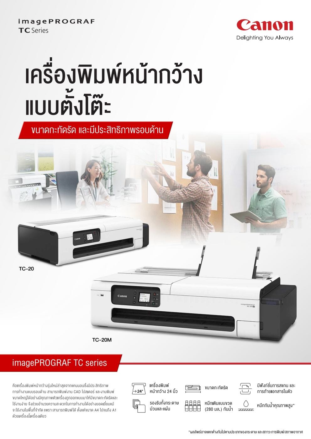 Canon imagePROGRAF TC-20ประสิทธิภาพและคุณภาพการพิมพ์อันยอดเยี่ยมที่มาพร้อมกับความกะทัดรัดTC-20 เป็นเครื่องพิมพ์หน้ากว้าง 24 นิ้วแบบตั้งโต๊ะที่รองรับม้วนกระดาษและช่องป้อนกระดาษอัตโนมัติมาตรฐานในตัว สำหรับพิมพ์งานเขียนแบบและโปสเตอร์คุณภาพสูงในสถานที่ทำงานแบบไฮบริด |
